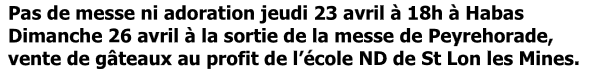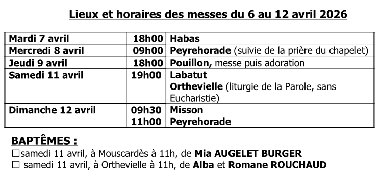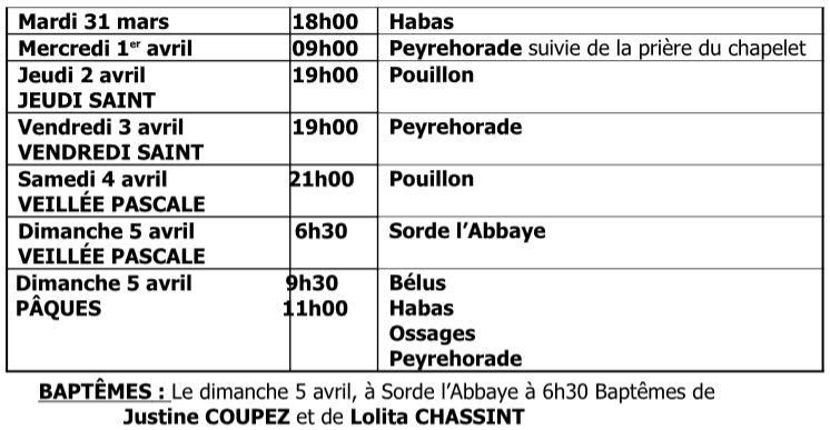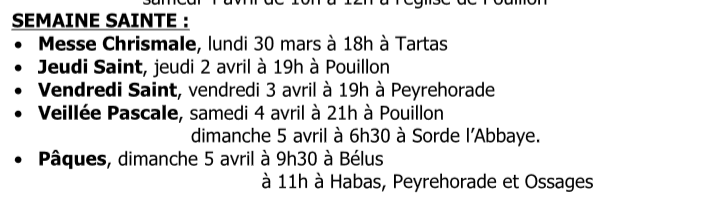 - Samedi 11 avril à 10h à Peyrehorade, préparation liturgique