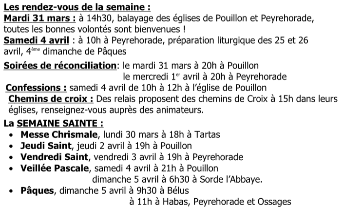 - Samedi 28 mars à 10h à Peyrehorade, préparation liturgique