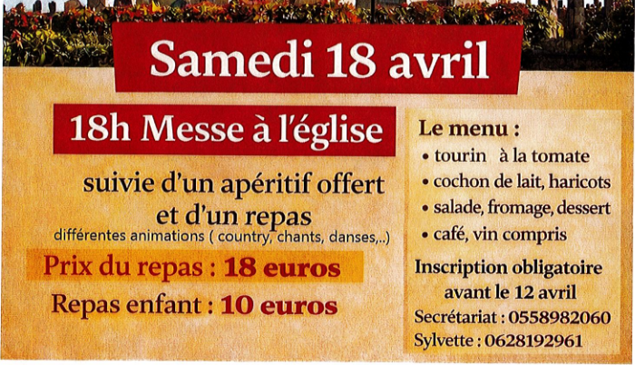 Le repas de la kermesse est sur inscription avant le 12 avril, n'attendez pas, contactez