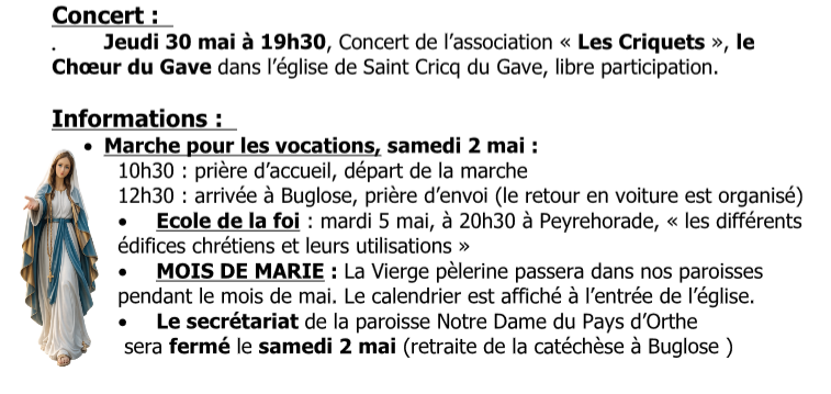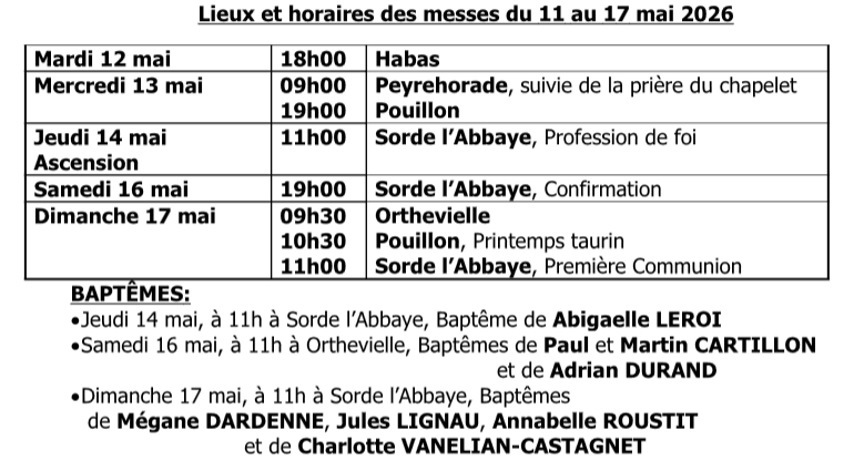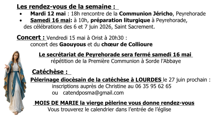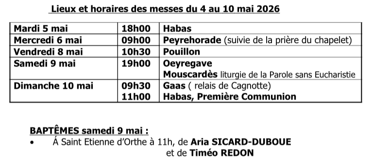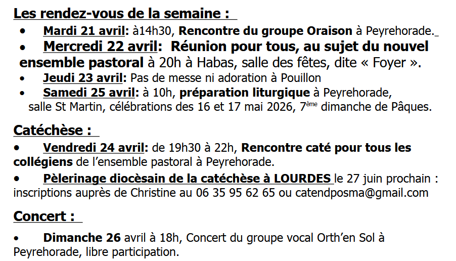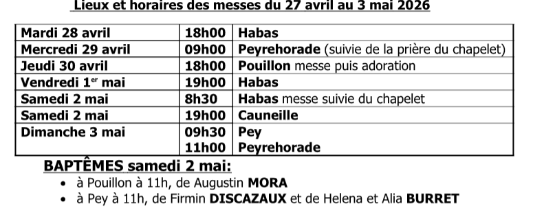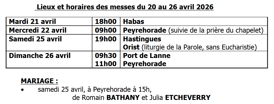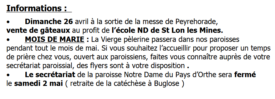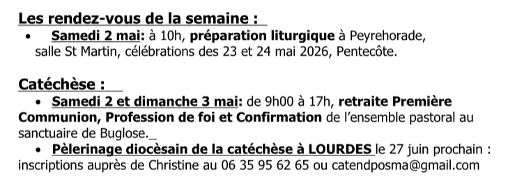 - Samedi 25 avril à 10h à Peyrehorade, préparation liturgique