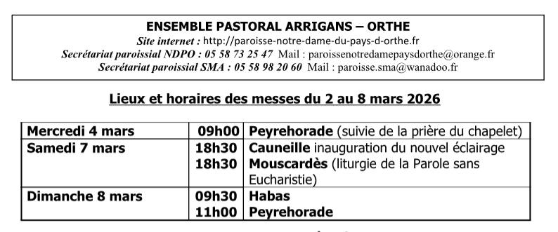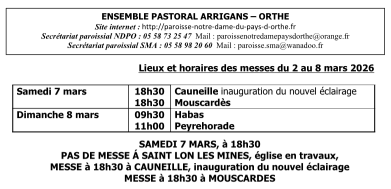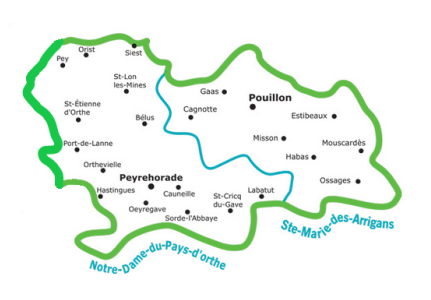 - La paroisse NOTRE DAME du PAYS D'ORTHE, avec les relais (villages) de Bélus, Cauneille, Hastingues, Labatut, Oeyregave Orist, Orthevielle, Pey, Peyrehorade, Port de Lanne, Saint Cricq du Gave Saint Etienne d'Orthe, Saint Lon les Mines, Siest et Sorde l'Abbaye.