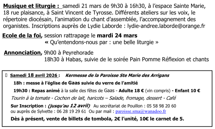 - Pèlerinage à Lourdes en soirée, samedi 31 janvier 2026, pour s'inscrire et obtenir plus d'informations, consultez l'affiche en cliquant ici