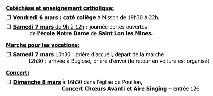 Mardi 24 mars, de 20h30 à 22h, rencontre de l'école de la foi, pour aborder le thème "une belle liturgie" qui n'a pas pu se faire le 6 janvier dernier, cause météo.