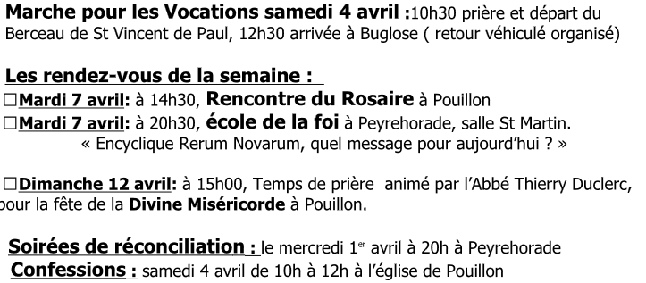 - Samedi 4 avril à 10h à Peyrehorade, préparation liturgique