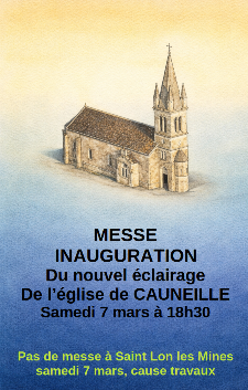 Une messe sera dite à Cauneille le 7 mars à 18h30, à l'occasion de l'inauguration du nouvel éclairage.