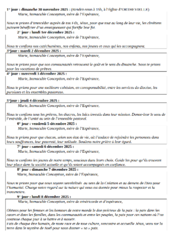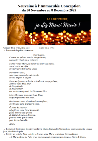 - La neuvaine de l'Immaculée Conception commencée le 30 novembre, se terminera le 8 décembre à 18h.