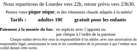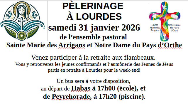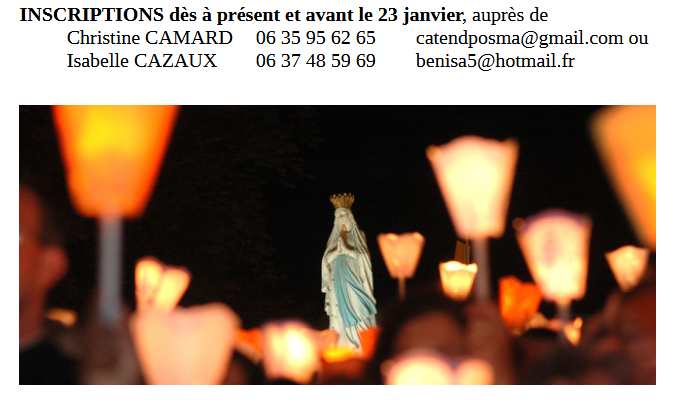 Le samedi 31 janvier et dimanche 1er février, les jeunes qui se préparent à la Confirmation, entourés des jeunes de l'aumônerie, les JdJ, les jeunes de Jésus, iront en retraite à Lourdes pour fortifier leur foi.